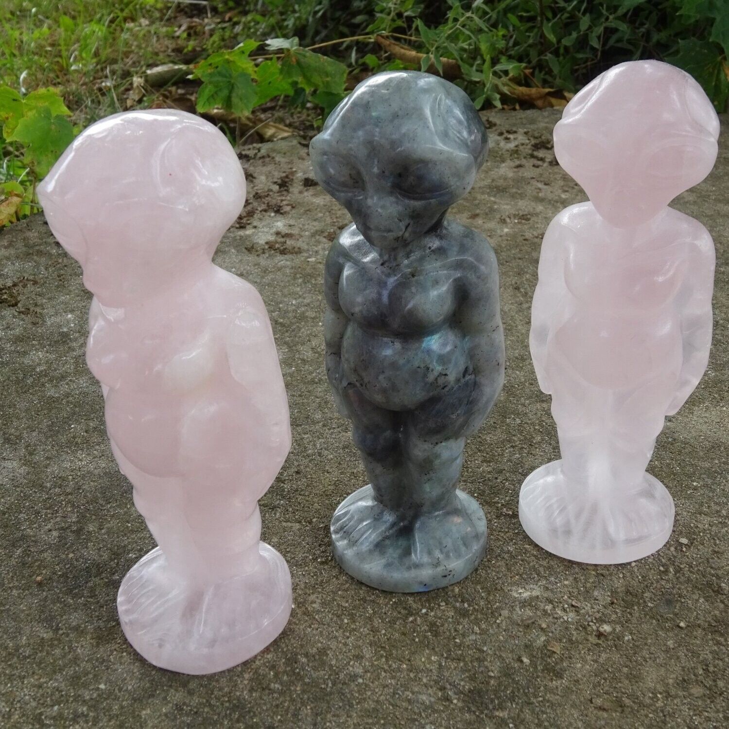 Etliche dieser Skulpturen sind weiblich und werden der Fruchtbarkeitsgöttin oder eben der Muttervolkkultur zugeordnet, welche lange nachweislich vor dem Patriarchat existierte. Sie haben eine seltsame Kopfform und große Augen und sind erkennbar schwanger. Für mich sind genau diese Skulpturen, Abbildungen der plejadischen Urmütter, weshalb ich mich ganz besonders darüber freue, dass diese nun auch als kristalline Replik erhältlich sind. Selbstverständlich aus unterschiedlichen Steinsorten, da jede plejadische Urmutter eine andere Qualität als ihre Schwester hatte.