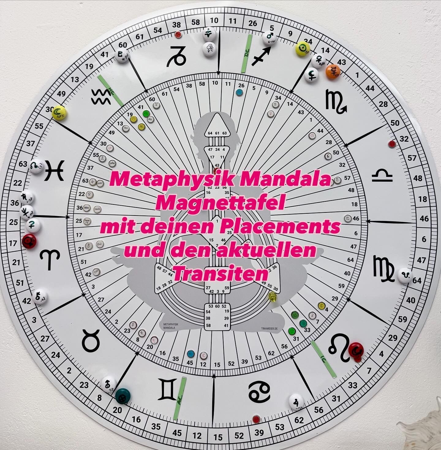 Dein kosmischer Kompass – Metaphysik zum Anfassen Dieses einzigartige Lern- und Erlebnistool verbindet Human Design, Gene Keys und AstrologieSternzeichen in einem lebendigen Jahreskreis. Innenkreis: Deine Geburts-Chart mit den archetypischen Potenzialen Außenkreis: Die aktuellen Transite – immer im Flow der Zeitqualität Magnetisch: Deine Planeten können bewegt, neu sortiert, reflektiert werden. Ob für Sessions, Teaching oder dein eigenes tiefes Eintauchen – dieses Mandala macht unsichtbare Energien greifbar. Ein Tool, das dich erinnert, wer du bist – und wohin du dich entwickelst. Lernen. Spüren. Verkörpern. Metaphysik zum Anfassen. Astrologie & Sternzeichen Die Astrologie zeigt, wie sich der kosmische Tanz der Planeten im Moment deiner Geburt in dir eingeschrieben hat – als archetypische Energie, die dich durchs Leben führt. Human Design Human Design offenbart deinen energetischen Bauplan – eine präzise Landkarte deiner Entscheidungen, deiner Aura und deines authentischen Ausdrucks. Gene Keys Die Gene Keys öffnen dir das Tor zu deiner inneren Alchemie – sie laden dich ein, die Frequenzen deines Bewusstseins zu transformieren, vom Schatten zum Geschenk, vom Mensch zum Mythos. Die tägliche Bewegung der Transit-Planeten ist wie ein fließender Tanz kosmischer Kräfte. Sie öffnet die Möglichkeit, in diese Verbindung einzutauchen. Was du erkennen kannst: Aktuelle Themen & Lernfelder Die Transite zeigen dir, welche Archetypen heute durch dich wirken wollen – wo du eingeladen bist, zu wachsen, loszulassen oder mutig zu handeln. Jeder Tag bringt neue Schwingungen mit sich. Resonanz mit deinem Chart Wenn ein Transitplanet ein Tor, ein Zentrum oder eine Achse in deinem Design berührt, kann das wie ein Verstärker wirken: Emotionen, Gedanken, Handlungen – alles steht plötzlich unter einer neuen Frequenz. Zyklen & Zeitfenster Du erkennst wiederkehrende Muster, persönliche Rhythmen und kollektive Phasen. Der Jahreskreis wird zur Bühne deines Bewusstseins- und Entwicklungsprozesses. Verkörperung des Jetzt Transite laden dich ein, ganz im Moment zu sein: Was will heute durch dich gelebt werden? Was ruft dich aus der Tiefe deiner Seele? Synchronizität & Entscheidungskraft Wenn du die Bewegungen der Planeten liest, erkennst du den größeren Zusammenhang. Entscheidungen kommen nicht mehr aus dem Kopf – sondern aus einer tiefen Verbindung mit dem Leben selbst. Jeden Tag erscheint ein neues Kapitel deines inneren Buches. Die Transite schreiben mit. Du bist die Stimme und der Körper, die sie erleben. Das Metaphysik Mandala macht diese Bewegungen sichtbar – damit du sie spüren, deuten und verkörpern kannst. Warum gibt es dieses Metaphysik Mandala? In diesem Mandala habe ich die 3 Apps, mit denen ich fast täglich arbeite, vereint, um sie offline zu nutzen und es für mich visuell und ganz physisch greifbar zu machen. Mein Zwillinge-Aszendent Spielzeug jetzt auch für dich: Im Jahreskreis die Astrologie Sternzeichen, Human Design Körpergrafik, I Ging/Genekeys/ Tore/Schlüssel in einem Mandala vereint. Übersichtliche Darstellung. Ideal, um die aktuellen Transite mit den Geburtsplacements visuell darzustellen. Auch als Lerntool für die verschiedenen Methoden geeignet. Du kannst die Planentenbewegungen verfolgen und so jeden Tag beobachten, wer sich schnell bewegt (z.B. Mond), wer langsamer ist und auch diejenigen, die sich gefühlt fast gar nicht bewegen (z.B. Pluto). Du kannst erkennen, welches Sternzeichen und welches Tor aktiviert wird. Das kannst du dann mit deinen Geburtspositionen in der Mitte vergleichen. Wird dadurch ein Kanal aktiviert? Wird dadurch ein Zentrum definiert, dass du ansonsten undefiniert/ offen hast? Wo fühlst du es im Körper? ************************************************************* Wenn Du Interesse hast: schreibe mir deine Bestellung mit Angabe deiner Wunschgröße an shop@tinameier.de METAPHYSIK MANDALA Magnettafel rollbar 60 cm 99€ inkl. 19% USt 30 cm 59€ inkl. 19% USt inklusive 30 Magneten und Punktaufklebern für deine Planeten. Preise bei Abholung in Hamburg oder zzgl. Versandkosten.